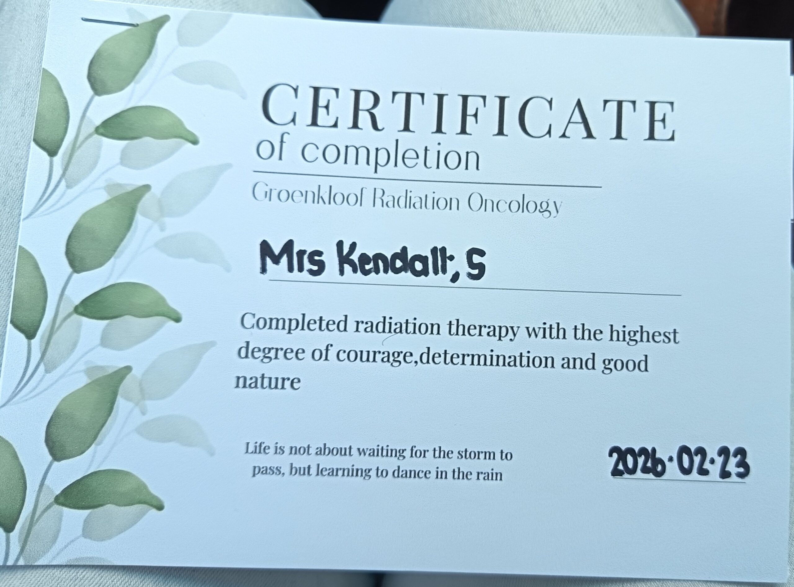 On 22 October 2025, after a routine mammogram, I was told that a biopsy was needed on my left breast, which was done immediately. Two days later I received a phone call confirming that stage one lobular cancer had been detected. Putting the phone down, Charles and I immediately prayed and gave this new journey…