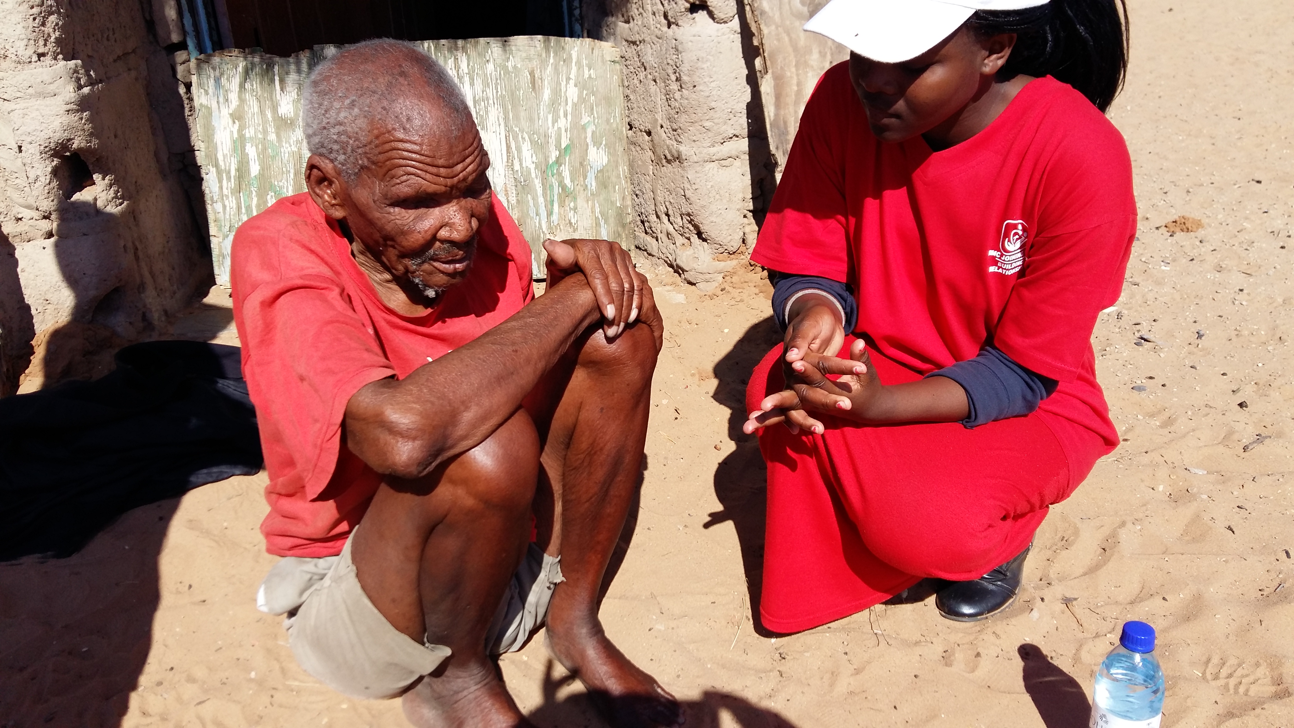 I was so humbled and blessed to have this opportunity. Meeting a blind, old man who could no longer walk, who crawled out of his hut into the warm winter sun every day became an honour. Oratile, Tshego and I felt we would like to bless him with a wash. Armed with warm water in flasks we planned to wash his dirt caked hands and feet. He was so overjoyed he wanted his arms, legs and upper body washed too. We cut his nails, cleaned them and used body lotion to rub into his wrinkled skin. He giggled as we gently cared for him, saying he was so happy. We then did the same for his older sister who takes care of him. We visited them five times and were so touched, even having the opportunity to meet inquisitive members of their family. I took a picture of the 4 generations and talked to them about caring for each other.